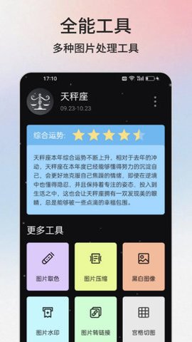 1、它不仅提供了天气、直尺、图片处理、星座运势等实用功能,还具备手电筒、图片压缩率调整、智能背景去除等特色功能。