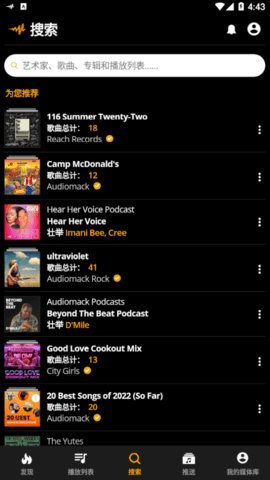 3、Audiomack中文版还提供了按情调、流派等专业策划的播放列表,让用户能够更方便地发现自己喜欢的音乐。