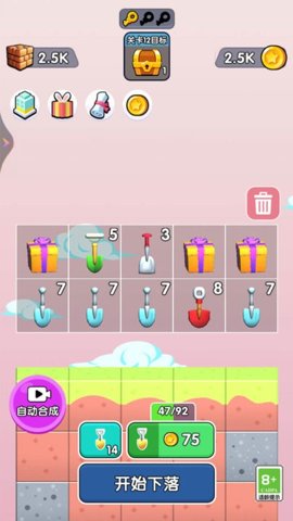 1、游戏玩法轻松有趣,玩家需要不断提升挖掘铲子的等级,挖掘更多的资源。