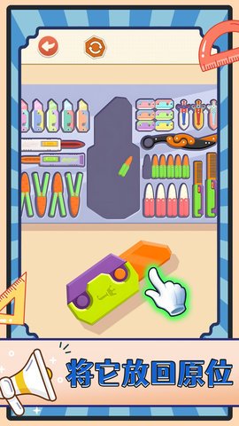 2、玩家需要用手指在屏幕上滑动,将画面上的物品一一摆放整齐,把物品收纳到它们的归属位置。