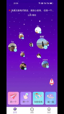 树洞聊天交友是一款交友应用,提供语音交友功能。你可以通过【摇一摇】来寻找缘分和快乐,当你摇到有缘人时,可以立即开始在线好友交流。如果你有心里的话想说给有缘人听,可以选择【扔个瓶子】,将你的心声传达给他们。