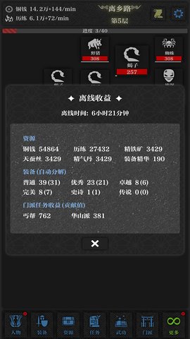 2、放置武侠的玩法让玩家能够轻松享受游戏,又能体验到大侠的成就感。