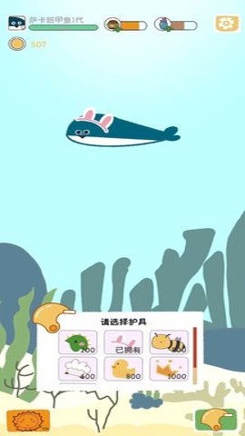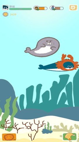 4、 玩家们可以领养一条鱼,并通过金币购买食物、清洁工具和护具来照顾它。