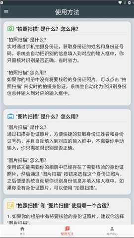 1、 红蚁身份核验App是一款手机身份检验助手工具,用户可以通过图片扫描、拍照扫描或手动输入的方式进行身份验证。