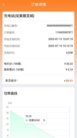 4、 德力充充电助手还提供了详细的充电站信息,包括充电开始、结束、充电时长和费用等。