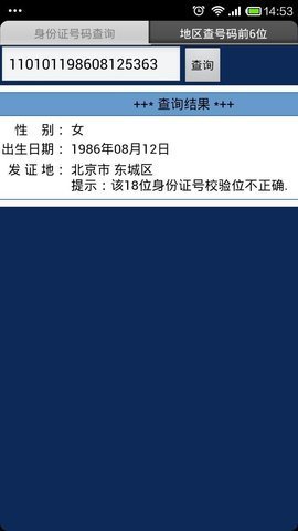 3、通过输入身份证号码,用户可以查询到一些个人信息,如发证地、生日和性别等。