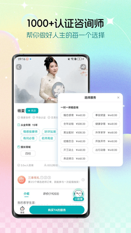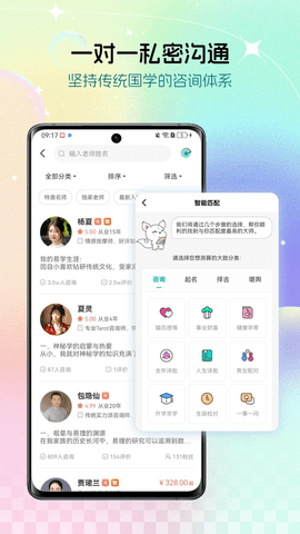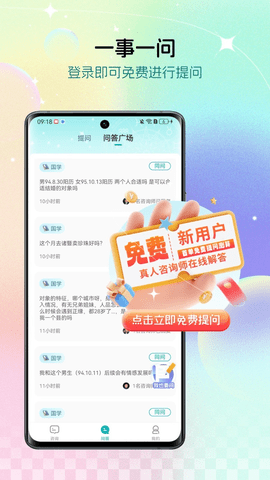 新增泛心理咨询平台让用户可以在线与老师发起一对一私密咨询,来自全国各地的名师大咖平均拥有15年以上从业经验,为用户提供实时的在线一事一问,真人2小时快速解答服务,一键提问功能,轻点问,即可发送问题。特别设立的闪问速答功能让用户无需等待和预约,即可享受即问即答的便捷体验。平台内置的海量热门问题库不仅覆盖各类生活场景,还巧妙融入国学元素,让用户在解决问题的也能感受到国学的魅力。