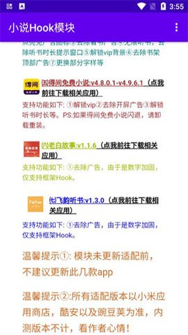 4、 小说hook模块最新版还是一款阅读插件,适用于多个知名阅读平台,包括老白故事、番茄畅听、笔趣阁等。