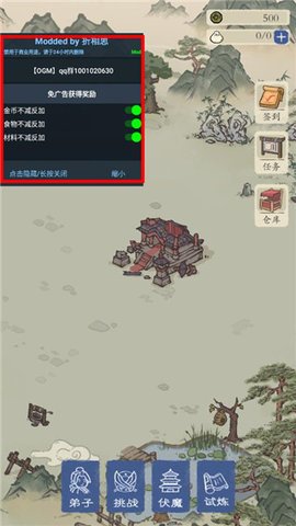 2、 这款门派经营游戏内置了作弊菜单,玩家上线即可享受免广告获取资源的特权。