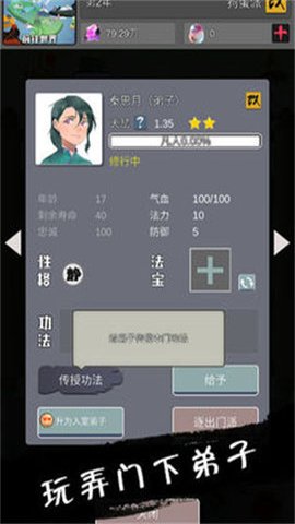 2、玩家可以招收有天赋的弟子,给予他们修炼资源,提升他们的属性和进阶。
