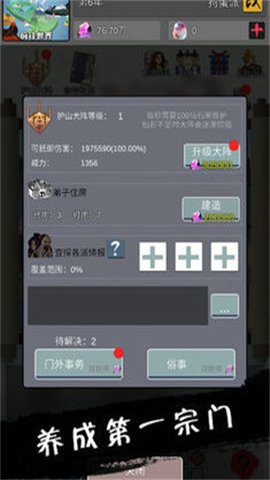 3、门派事务分为门外事务和俗世,完成这些事务可以获得大量的仙石,用于门派的建设和发展。