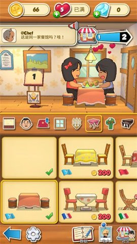 3、玩家可以利用收集到的金币逐渐打造出一个适合自己口味的主题餐厅,不论是中式、意式还是法式,都随你喜欢。