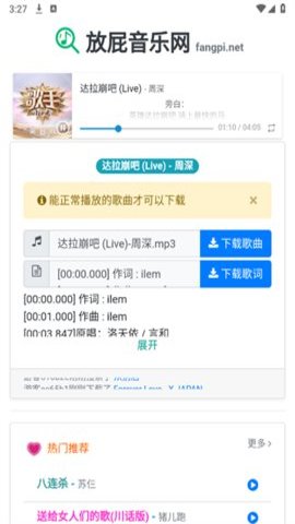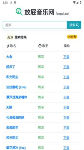 2、放屁音乐网App还支持离线下载功能,这意味着你可以将自己喜欢的歌曲下载到手机中,在没有网络的情况下也可以随时听歌了。