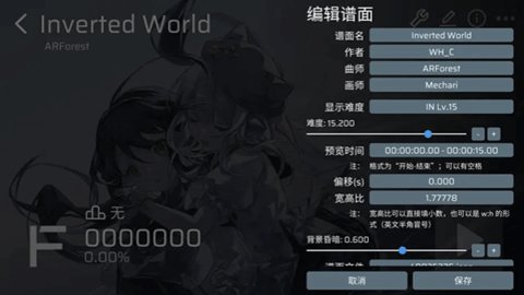 3、 在练习开始段落,你可以点击铅笔图标,屏幕右边会出现谱面设置界面,你可以在这里调节谱面的定数、宽高比和Tip等参数,请记得保存。