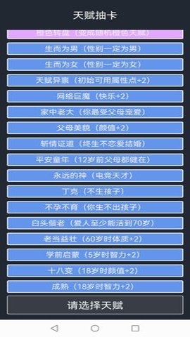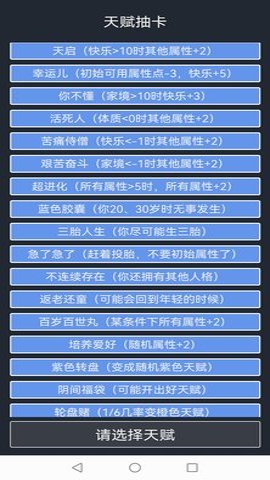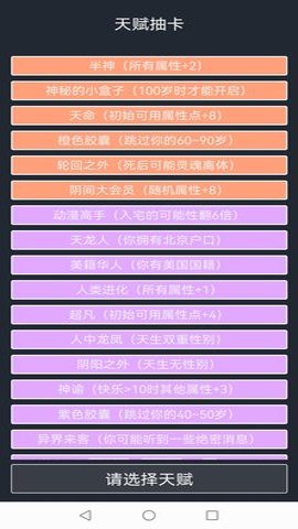 1、 开挂版人生重开模拟器为玩家们准备了无限天赋,让你可以解锁全天赋,随意选择和加点属性。