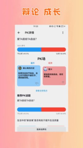 2、软件还提供了PK功能,让你可以与他人进行深刻的讨论和辩论,探索分歧和相同之处,从中获得成长和洞察力。