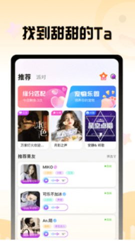 1、 果甜语音的安卓版本是一个集合了小游戏、匹配交友和多人语音连麦功能的社交应用。