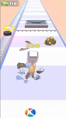 3、玩家需要使用小铁锤进行砸矿,边跑酷边收集宝石,游戏中多样化的道具也能让玩家更快地奔跑和更高效地收集宝石。