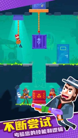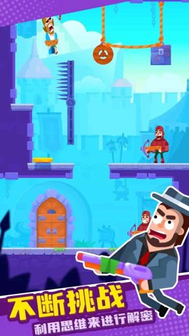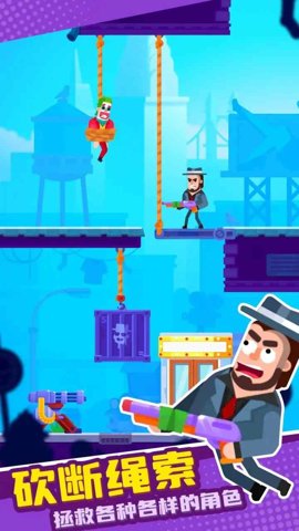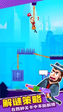 2、玩家需要下拉绳索,让小人滑下来,然后将绳索切断,拯救被捆起来的小人。