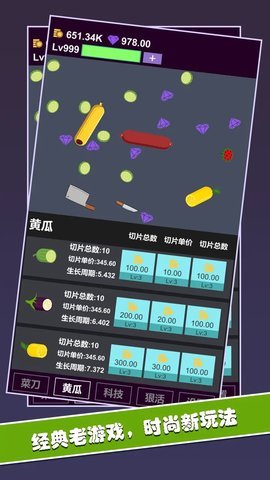 黄瓜茄子切切切是一款适合各年龄段玩家的休闲挂机游戏。游戏的整体玩法以放松和休闲为主,无论是儿童还是成人都可以通过它来放松自己。游戏中有多种刀和食物,功能多样,玩法丰富多样。
