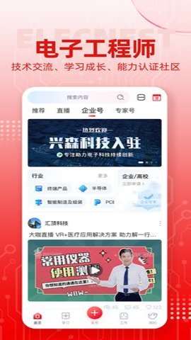 电巢科技是一款社区论坛应用,为广大电子工程师和电子爱好者们提供一个学习交流的平台。该应用中包含了多个功能模块,包括【电巢号】、【巢课】、【科技资讯】、【电子论坛】和【电巢知识社区】。 【电巢号】是一个直播平台,任何人都可以成为创,在这里分享自己的创作和经验。