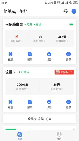 小亿家是一款充值缴费应用,提供便捷的充值缴费服务,涵盖随身wifi、流量卡等多种产品,还提供多种实惠流量套餐供用户选择,让用户享受到更加优惠的服务。在使用过程中,如果遇到网速慢、指示灯异常、无法联网等问题,用户可以通过智能诊断功能快速了解问题所在,包括套餐资费、设备电量、设备在线状态、设备信号等,让用户轻松解决问题。