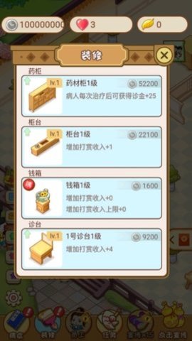 2、玩家还可以用自己赚取的钱购买更多更好的医疗设备,提供更好的设施和药材,为病人治病。
