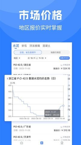 2、实时行情跟踪:水泥指数App提供了实时的市场行情跟踪功能,用户可以了解最新的水泥建材价格,以及走势波动情况。