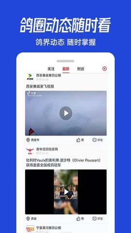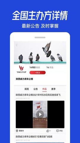 3、用户可以通过这个应用了解最新的鸽类资讯,包括赛事直播、成绩查询、鸽闻资讯等。