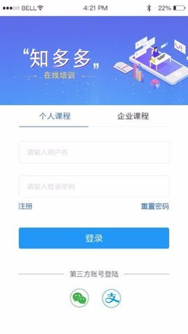 知多多是一款综合性的学习办公、学习型平台和学习辅助应用。它提供了多种适岗培训课程类别,以满足不同岗位和职业发展的需求。用户可以通过该应用进行第三方快捷登录,包括微信登录和支付宝登录,方便快速进入应用。