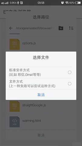 4、在弹出的“选择操作”窗口中,用户可以选择【文件】,然后找到手机中的Tampermonkey扩展插件文件,并进行。