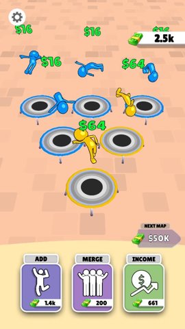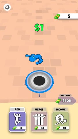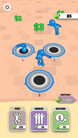 1、你需要控制角色进行蹦床跳跃,蹦起来积攒金币,增加蹦床数量,提高蹦床收入,合体提升等级。