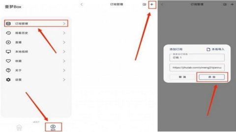 3、如果想要导入外置多仓接口,可以按照下方的介绍进行操作:点击“我的”-“订阅管理”-右上角的“+”号-直接点击“添加”,就可以导入千在线多线路接口。