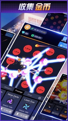 1、在冒险的过程中,玩家还可以解锁更多的飞刀,并通过强化来提升它们的战斗能力。
