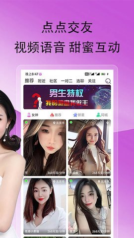 1、点点交友软件是一款智能匹配、视频聊天的交友平台,提供了情感话术库和结伴出行等功能。