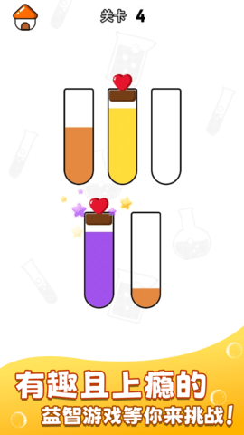倒水排排序是一款富有挑战性的益智游戏,玩家将扮演一位排序大师,在有限的工具和资源下解开一个又一个看似不可能的任务。这款游戏不仅仅是一种娱乐方式,更是一种教育意义的体现。通过享受游戏的乐趣,玩家可以培养逻辑思维、策略规划和解决问题的能力。