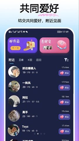 2、与他app还具备定位功能,可以帮助用户发现身边的朋友或志同道合的人,方便用户组织线下见面活动,促进真实社交互动。