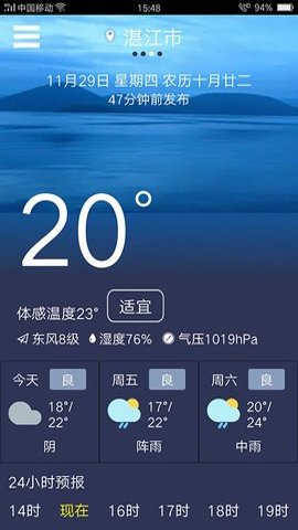 2、通过简洁大方的界面设计和精准的天气数据,用户可以轻松获取到所在城市的即时天气情况,包括温度、湿度、气压等气象数据。