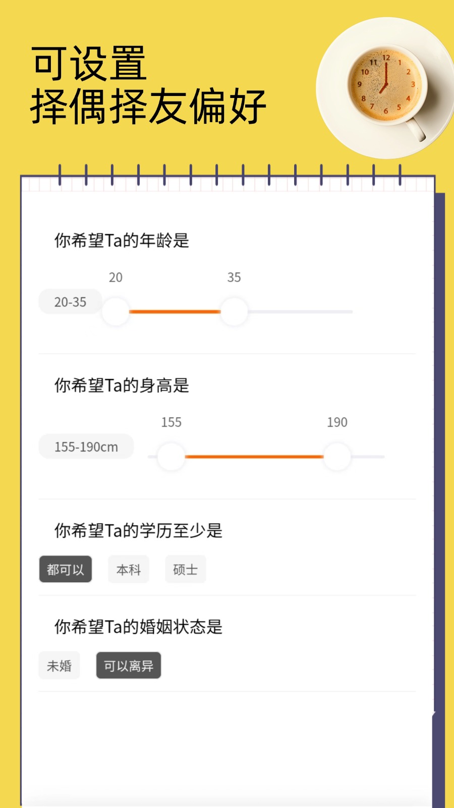 依见APP的界面设计简洁明了,操作流程简单易懂。用户只需下载APP,完成注册和身份认证,即可开始寻找合适的对象。系统会根据用户的偏好,推荐附近的咖啡厅进行线下见面,用户可以轻松预约时间和地点,享受便捷的相亲体验。