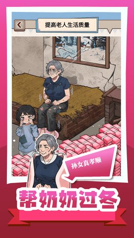 帮奶奶过冬是一款趣味休闲游戏,适合老年人综合锻炼。游戏的主线故事情节非常感人,让玩家在帮助老人的同时收获很多快乐和感动。 游戏场景构建非常用心,细致的画面和优美的音效让游戏变得更加温馨生动。