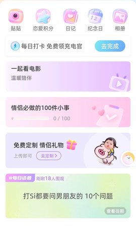 3、除了基本的打卡功能,应用内还有多种情侣互动玩法,如情侣必做的100件小事、情侣礼物推荐等,丰富了情侣间的互动体验。