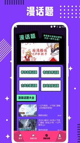 1、除了搜索功能,看看漫画工具还提供了超多的热门话题互动,让用户能够参与讨论、交流自己对漫画的喜爱之情。