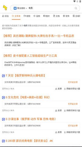 3、皮卡搜索App内置了强大的搜索功能,你可以输入你想要查找的关键字,然后就能够看到与之相关的资源。