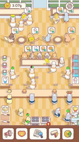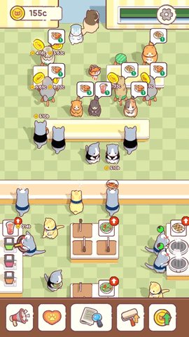 2、为了提高店铺的效率和服务质量,玩家可以招募可爱的服务员和厨师,他们会帮助玩家更好地经营店铺,让猫咪顾客们更加满意。