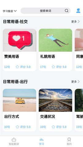 俄语翻译通是一款功能强大的学习软件应用。它为俄语学习人群设计,提供了丰富的内容支持,包括词库、主题词汇和日常用语等。这些内容可以随时随地通过随身听播放应用内的功能来学习。