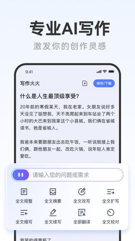 2、写作火火还具备自我学习和优化的功能,能够轻松创作各种类型的文章,提高创作效率。
