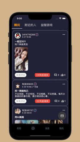 1、除了多样化的聊天方式和高度的私密性,寻知交友还提供了丰富的社交元素。