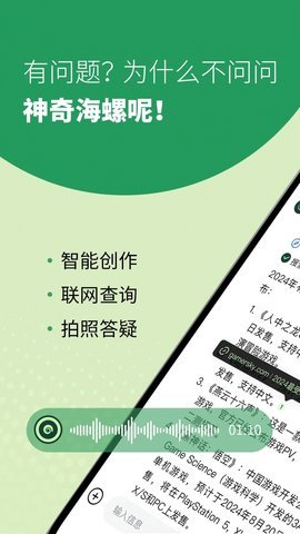 海螺问问是一款实用工具应用,多功能性「应事」品牌全新升级为「海螺问问」安全性智能创作。它能够帮助用户解答、获取信息、进行创作等,让用户在使用过程中更放心、更安全。 海螺问问拥有多项实用功能,包括联网查询、语音通话、拍照答疑、文件速读和闲聊对话等。