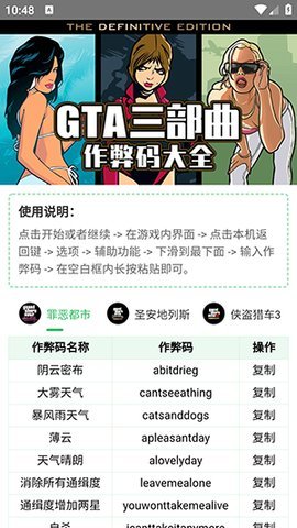 3、GTA作弊码大全APP是专为GTA系列游戏的热衷玩家而设计的作弊码软件。