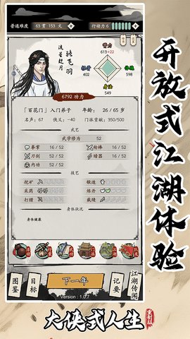 大侠式人生重制版是一款放置类休闲游戏,放置类卡牌手游游戏。游戏中有丰富的武侠剧情和寿命设定,同时还加入了多线剧情的开启,让玩家的武侠人生变得独一无二。玩家可以加入各大门派,学习独特的新武学,并体验正反派各自专属的剧情。